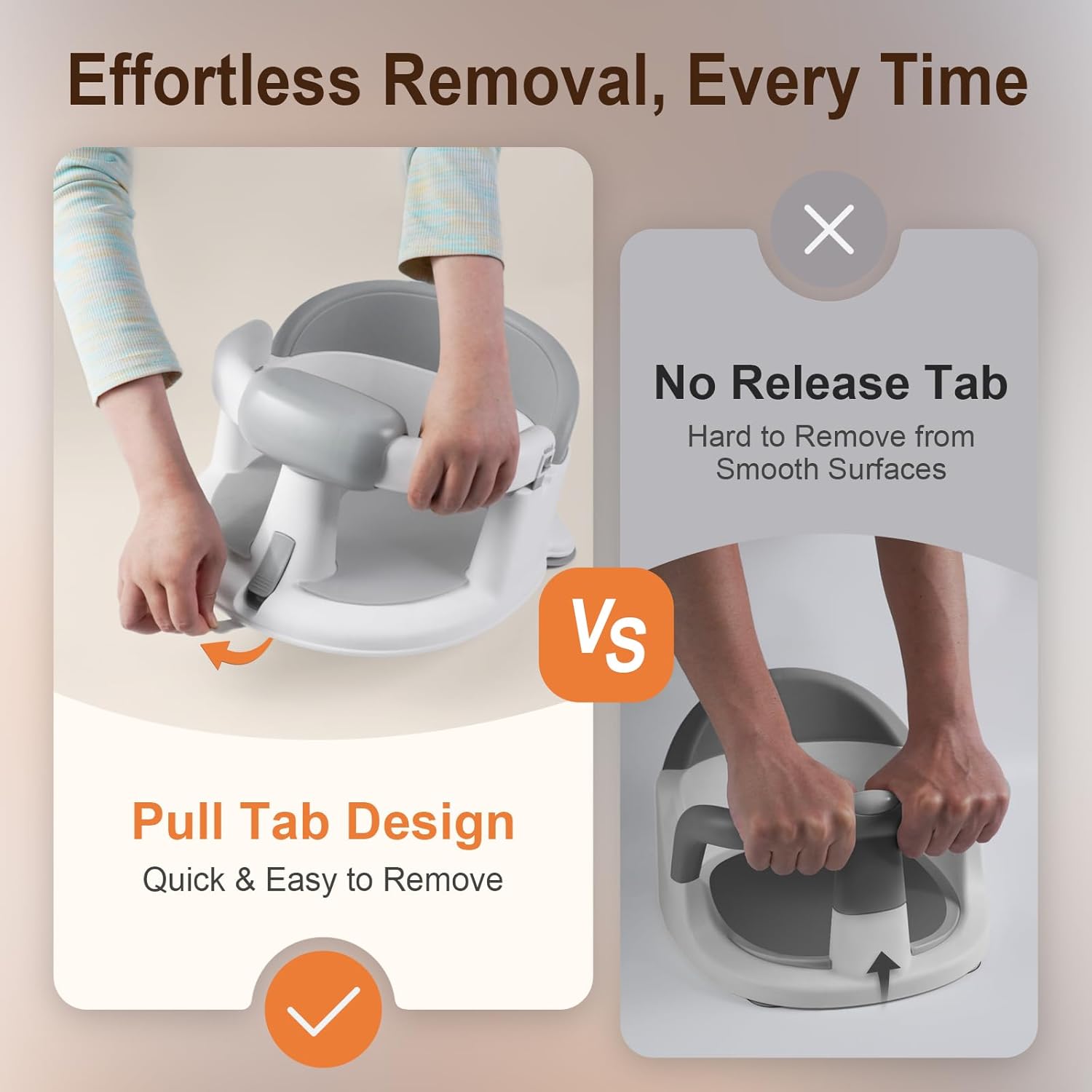 -Stay Secure, Remove with Ease: The 3 powerful suction cups, including a main one with a locking mechanism and pull-handle release, keep the seat firmly in place, ensuring stability during bath time. When it’s time to remove, the pull-handle allows for quick and easy suction release—no hassle, just convenience.