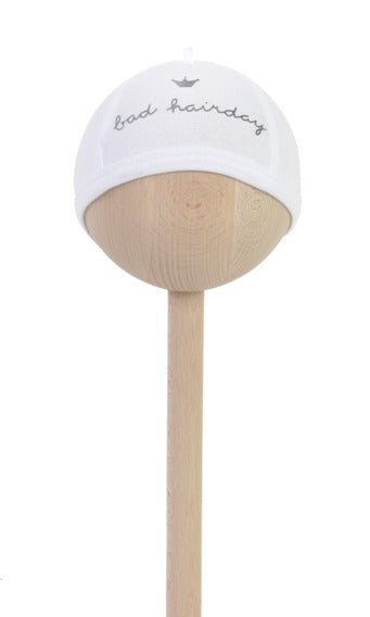 Bambam Bad Hair Day Hat offers newborns a comfortable and stylish start with its 100% soft cotton jersey construction and metallic silver "Bad Hairday!" print on crisp white fabric. Designed for practicality and cuteness, this gentle and breathable hat is ideal for hospital stays and everyday wear, ensuring your baby stays cozy and photo-ready.
