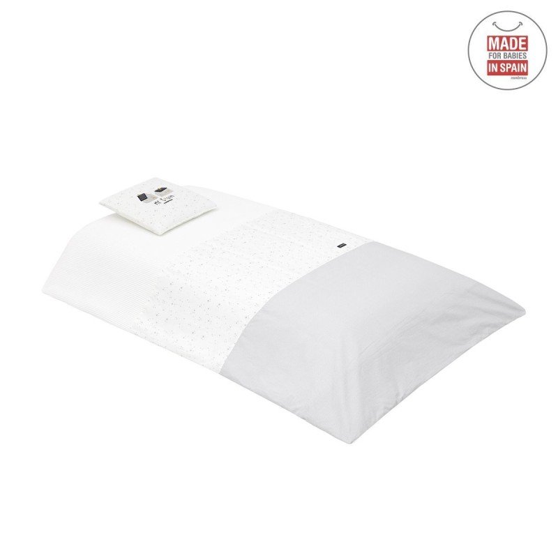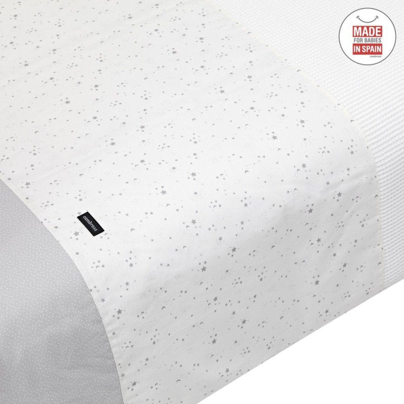 Cambrass Bedding Set 4 Piece in Sky Grey includes a duvet cover with removable padding, bumper with internal hollow fiber padding, and a decorative pillow, all crafted from 100% cotton for softness and breathability. Removable padding in the duvet cover ensures year-round versatility and easy washing, while the padded bumper provides added safety by cushioning your baby from crib impacts. Elegant sky grey color complements any nursery décor, offering comfort, protection, and style for your baby's first months.