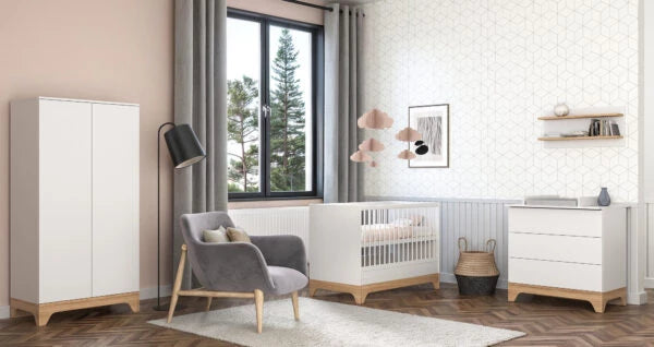 Constructed with panel and solid wood and supported by sturdy legs, this wardrobe combines stability with a premium aesthetic. The interior layout can be configured flexibly, allowing you to choose between hanging space or shelving. Additional shelves can also be purchased to further customize the storage to your needs. The wardrobe pairs perfectly with other pieces from the Lumina White collection, creating a cohesive, stylish nursery.