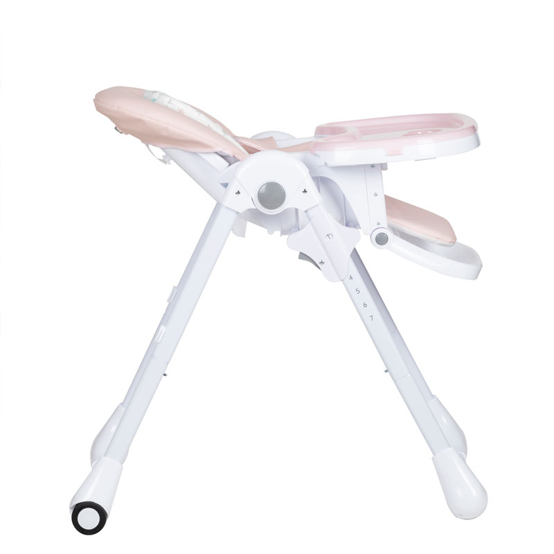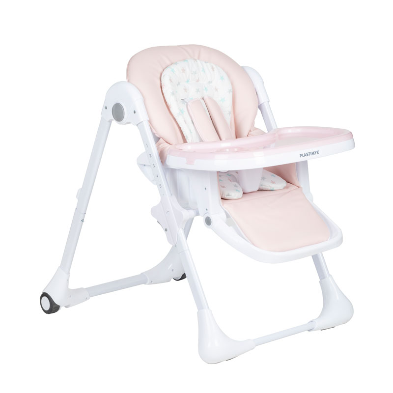 Plastimyr High Chair Twinkle Pink features a reclining seat with three positions and seven height adjustments for versatile comfort. Anatomical seat with a five-point harness ensures safety, while the adjustable tray and footrest adapt to your child's needs. Non-slip feet and two wheels provide stability and mobility, and the leather case is comfortable and easy to clean. Folds easily for convenient storage, making it ideal for modern family living.