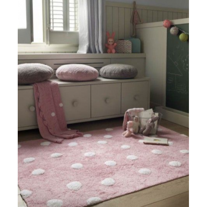 Polka dots are an elegant yet fun classic, always in fashion! Rug in 100% cotton, easy to wash at home (conventional washing machine with 6 kg capacity), some fun white polka dots add a touch of joy to the soft pastel colored background of this piece, perfect for nurseries and children's rooms, for both girls and boys... It is a sure hit in any decor! It is handmade, only natural dyes are used, making it very safe, and since it is made from cotton, it is light, soft and flexible.