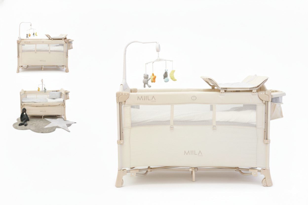 Miila Travel Cot offers a spacious play area and next-to-me connectivity for parents, featuring a musical mobile, diaper changing station, and mosquito net for enhanced comfort and safety. Foldable design ensures easy portability and quick setup, making it ideal for travel or home use. Available in Dark Grey and Grey, this playpen combines practicality with modern style for your baby’s needs.