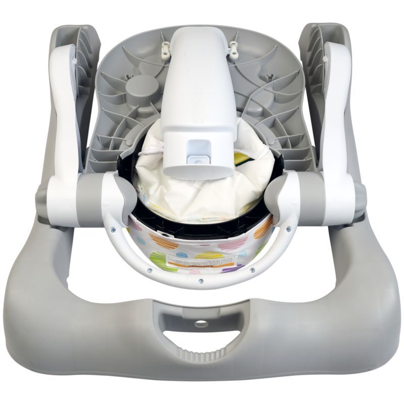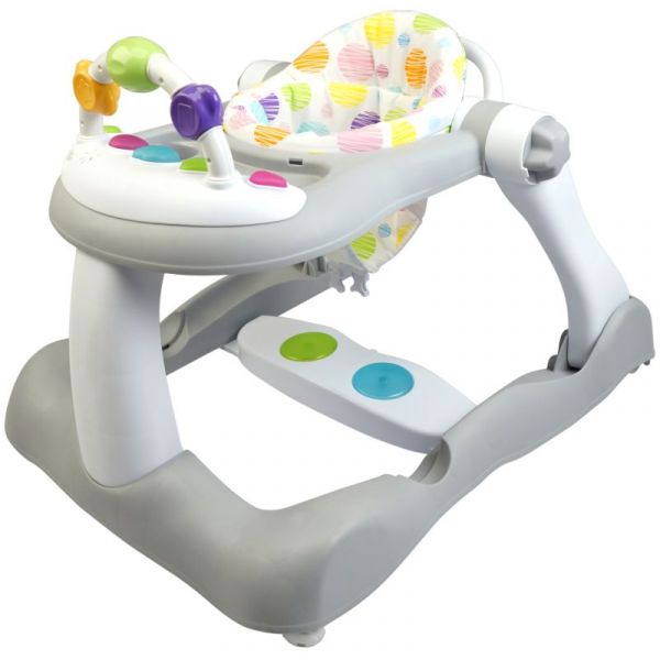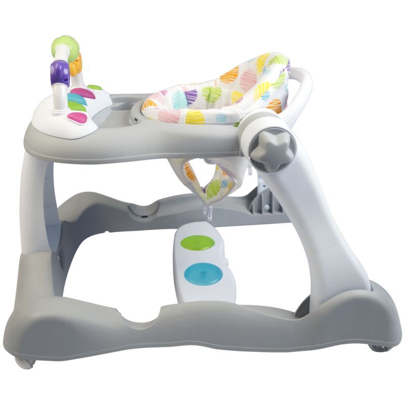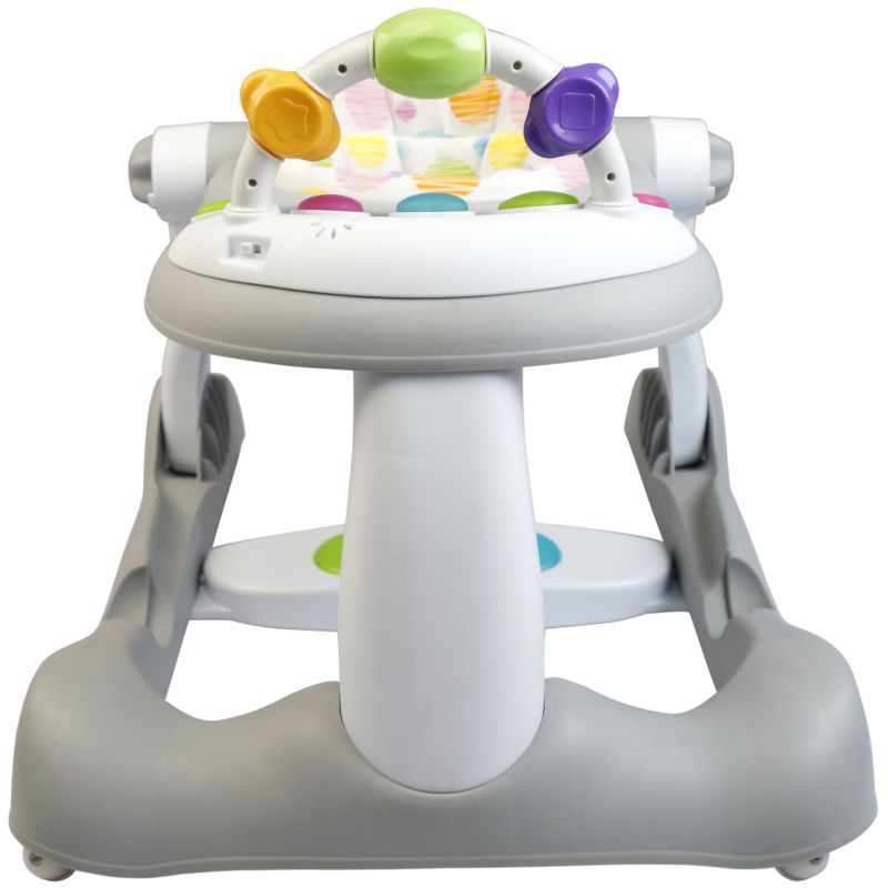 Spuddies Bounce Steps 3 In 1 Walker in Grey delivers interactive play and motor skill development with its electronic tray featuring lights and sounds, roomy comfort, and easy-to-clean seat pad. Two height adjustments and a unique walk-behind function adapt as your baby grows, while the wide, stable base and non-skid friction pad offer added safety. Folds flat for travel and storage, making it ideal for active families.