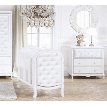 Trama Cot Bed Classic White features a solid pine wood construction with three adjustable positions to grow with your baby. Luxurious carved details and a padded chesterfield-style leatherette end create a premium nursery centerpiece. Natural woodwork and anti-toxic, anti-cancer water paint ensure safe, stylish comfort for your child. 100% made in Europe, this cot bed combines durability and elegance for modern nurseries.